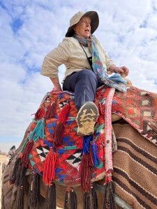 Khafre built the Great Pyramid in Giza. That’s where I rode the camel. The camel wore a saddle cloth with a number and the words Ali Bob Marley. I guessed this was the camel’s name, but I’m not sure. Now, I’m quite short and the camel was tall, even while kneeling. It took Ahmed plus the camel handler to get my foot in the stirrup, let alone get me into the saddle. And once I was up there I felt quite precarious, as I wasn’t seated quite right in the saddle.