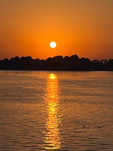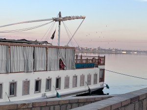 We left Cairo for Luxor, where the Queen of Egypt served as our hotel. It’s a dahabeya, a traditional flat-bottomed boat, which was towed by a tugboat, though one afternoon there was enough wind for us to sail. I spent plenty of time on deck, reading, making notes, but frequently just staring at the scenery on both sides of the Nile. As we passed villages, children gathered on the riverbank, waving and calling “Hello.”