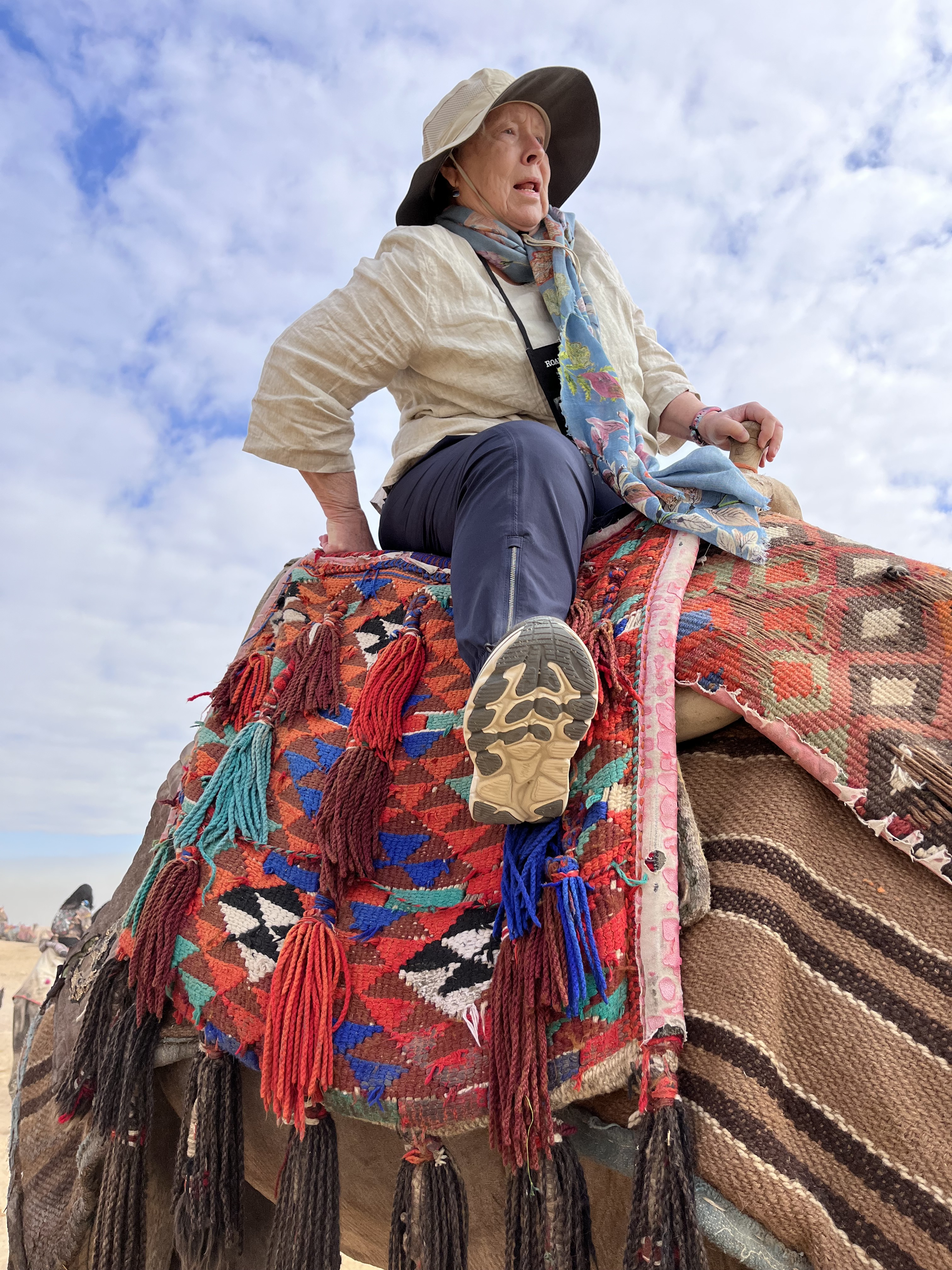 Khafre built the Great Pyramid in Giza. That’s where I rode the camel. The camel wore a saddle cloth with a number and the words Ali Bob Marley. I guessed this was the camel’s name, but I’m not sure. Now, I’m quite short and the camel was tall, even while kneeling. It took Ahmed plus the camel handler to get my foot in the stirrup, let alone get me into the saddle. And once I was up there I felt quite precarious, as I wasn’t seated quite right in the saddle.